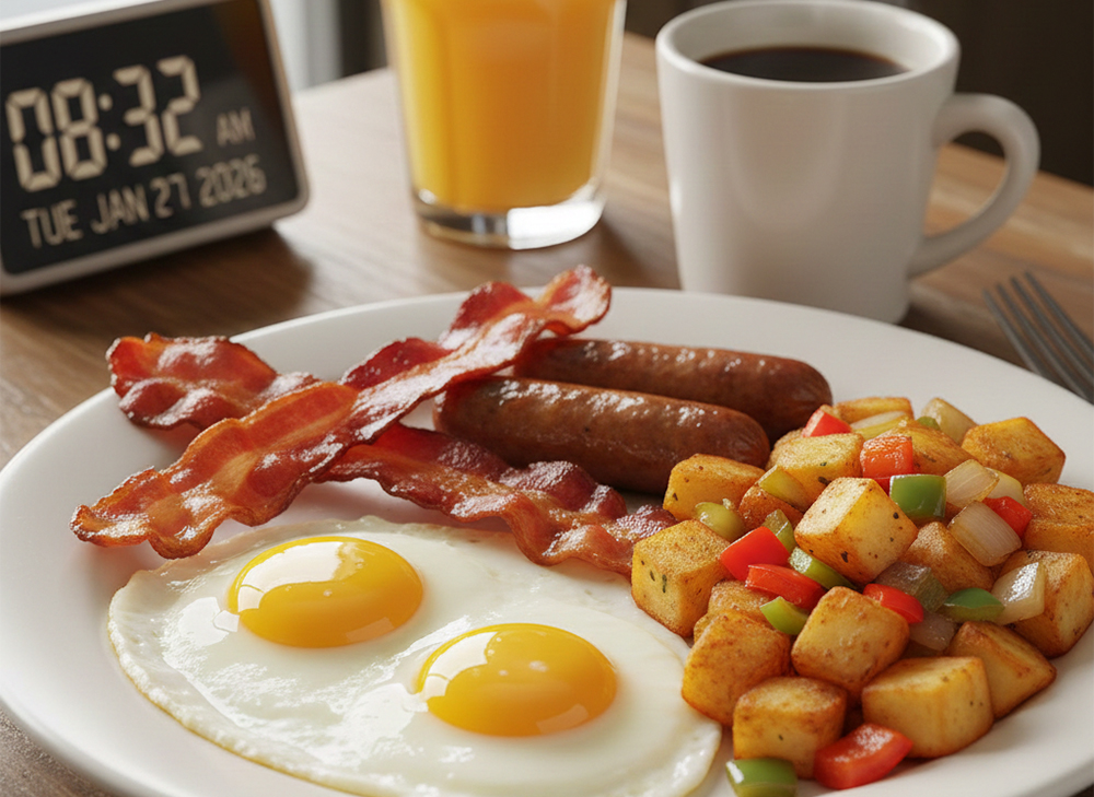 Eggs Your Way, Bacon or Sausage With Home Fries.