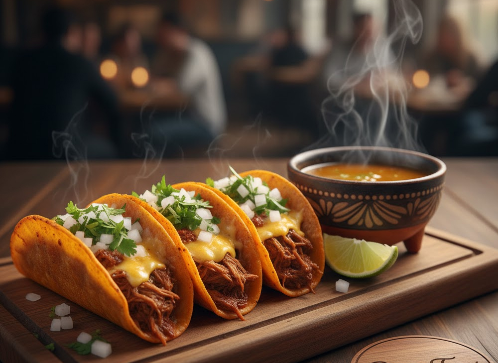 3 Tacos Beef, Cheese, Onion, Cilantro, With Special Dipping Sauce (Consomme)