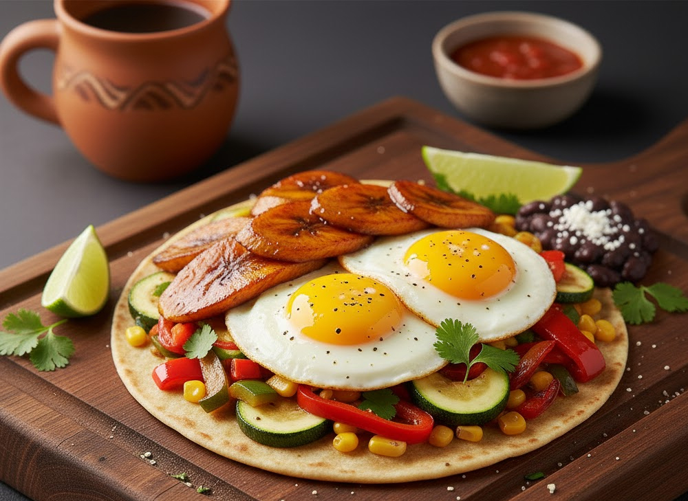 (Sweet Plantains, Eggs, Veggies, Avocado, Blackbeans on a Tortilla)