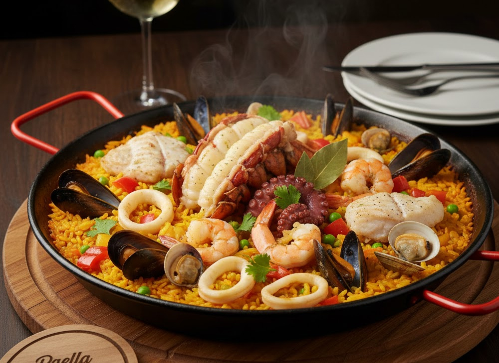 Saffron, White Wine, Combination of Vegetables With The Aroma of Bay Leaf, Lobster, Fish, Shrimp, Octopus Clam, Squid Caribbean Tradition