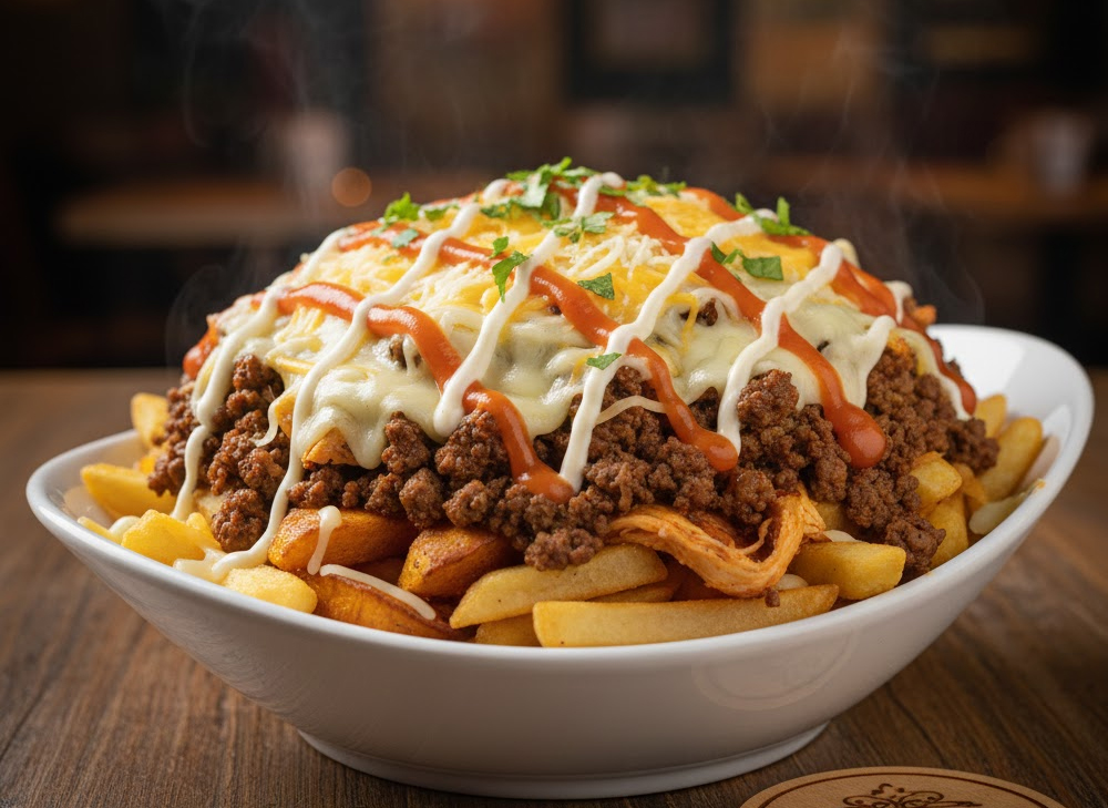 French Fries or Sweet Plantains, Cover With Choice of Meat Chicken or Ground Beef